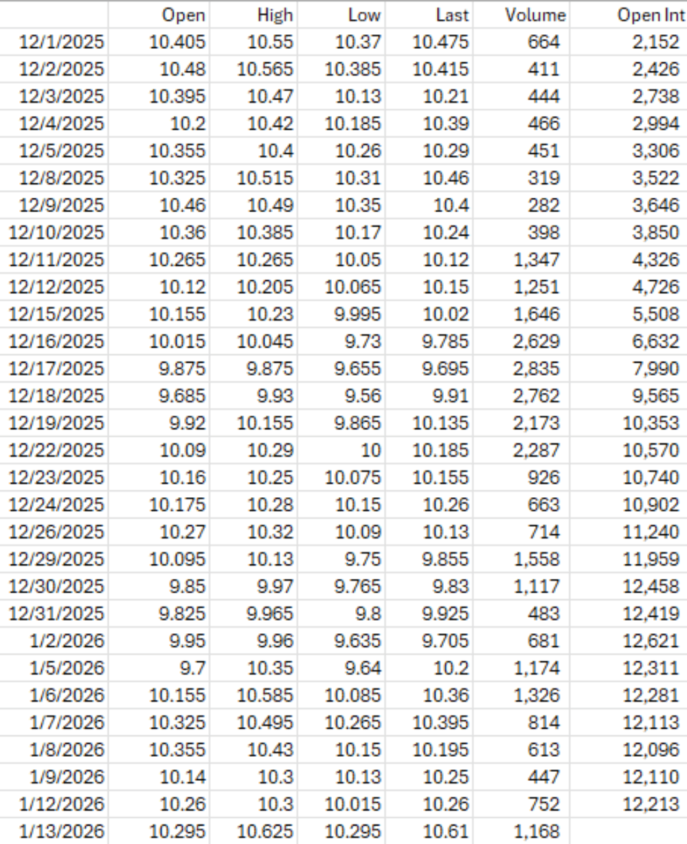 CBOT January ’26 Soybean Values, 12/1/25 through 1/13/26