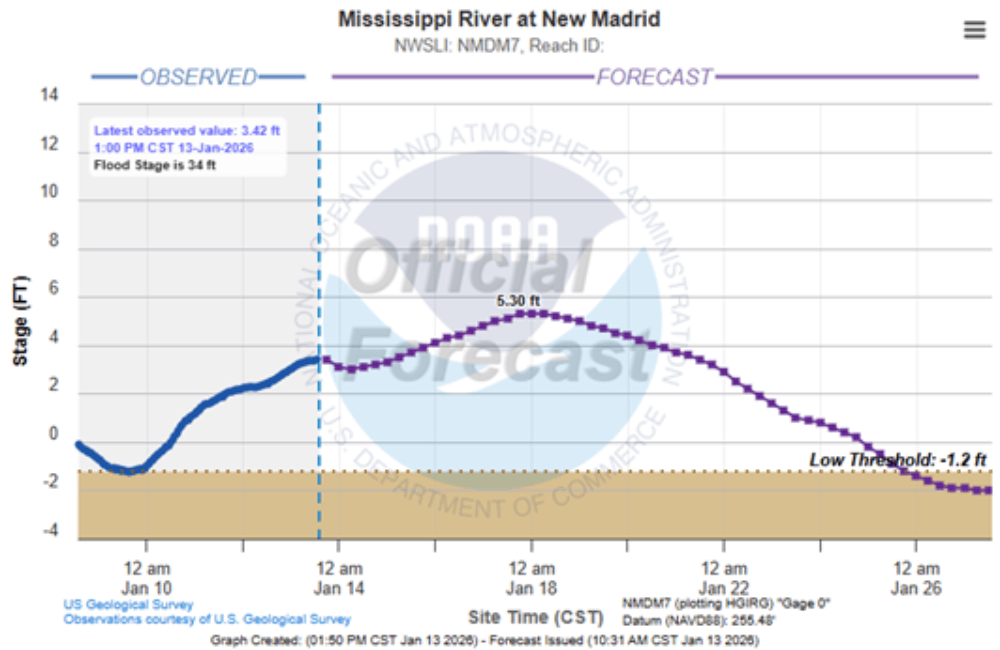 The Mississippi and Ohio River graphs show abnormally low levels for winter and will continue to drop without significant rain.