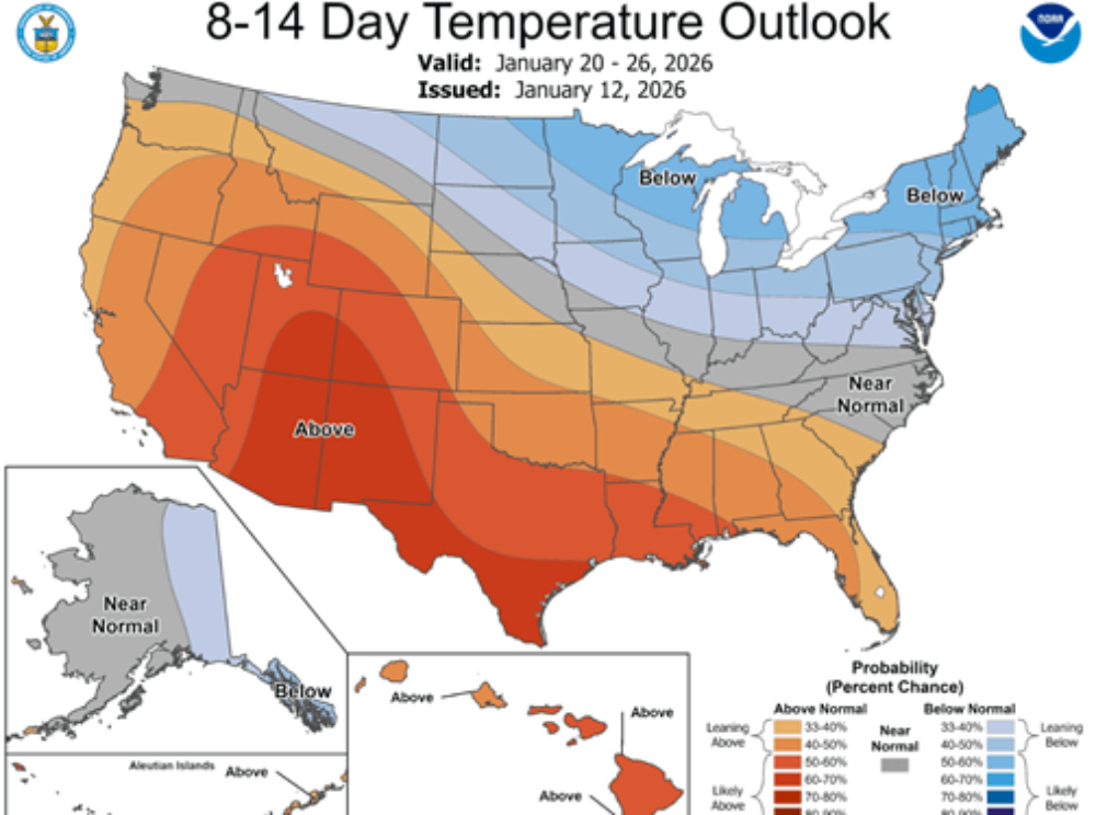 The near-term precipitation outlook shows little rain for Arkansas and Southern Missouri, however, the forecast for the last half of January shows potential for above normal precipitation. The long-term precipitation for the spring also shows above normal precipitation is possible, especially in Northeast Arkansas and Southeast Missouri. Temperatures are expected to be above normal for the next couple weeks, with the long-term outlook showing mostly normal temperatures for the spring.